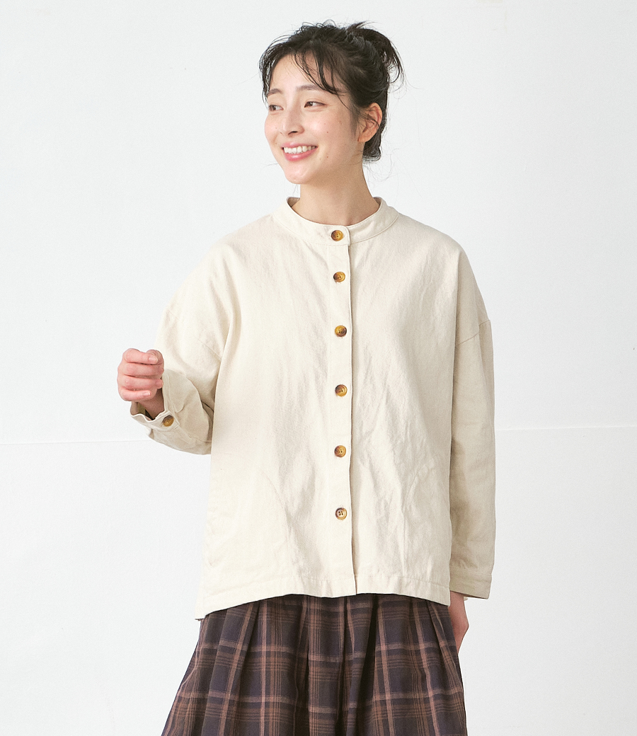 首もとをすっきり見せてくれるバンドカラーが、シンプルな中に上品さを添えます。