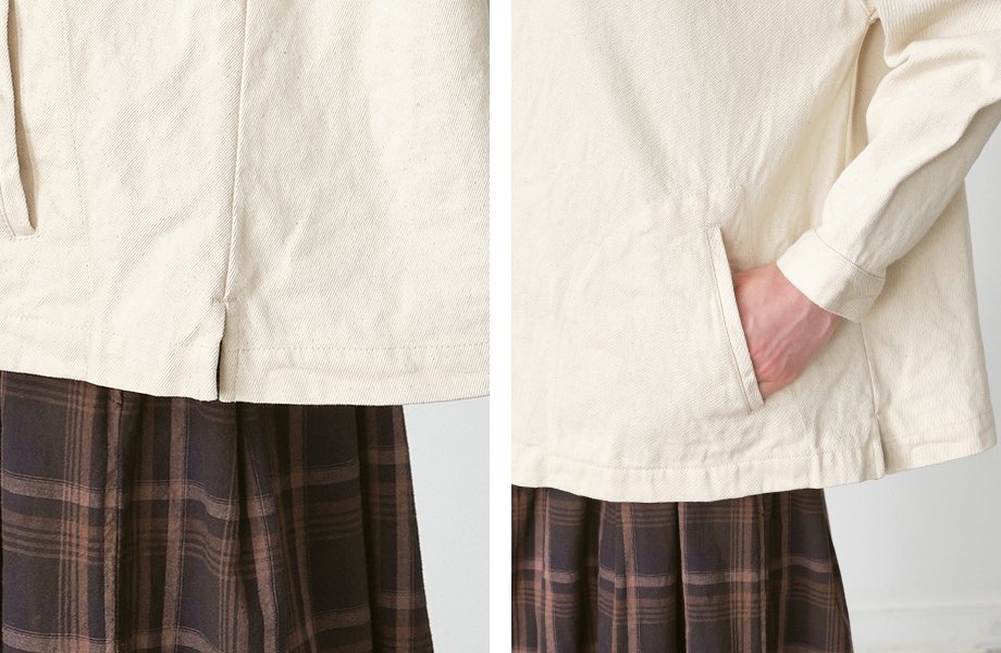 すっきりと馴染む位置に配されたポケットは、手を入れたときのシルエットも自然で、 さりげない立体感を生み出します。