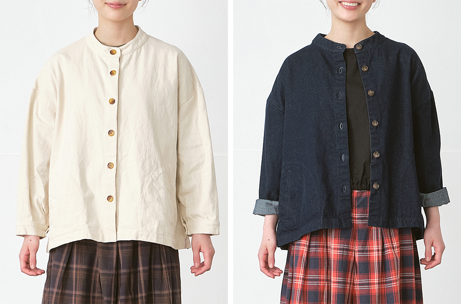 コンパクトな襟元が顔まわりをすっきりと見せてくれるバンドカラージャケット。