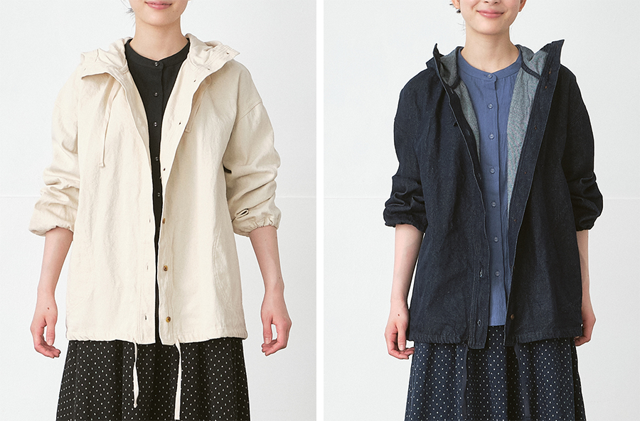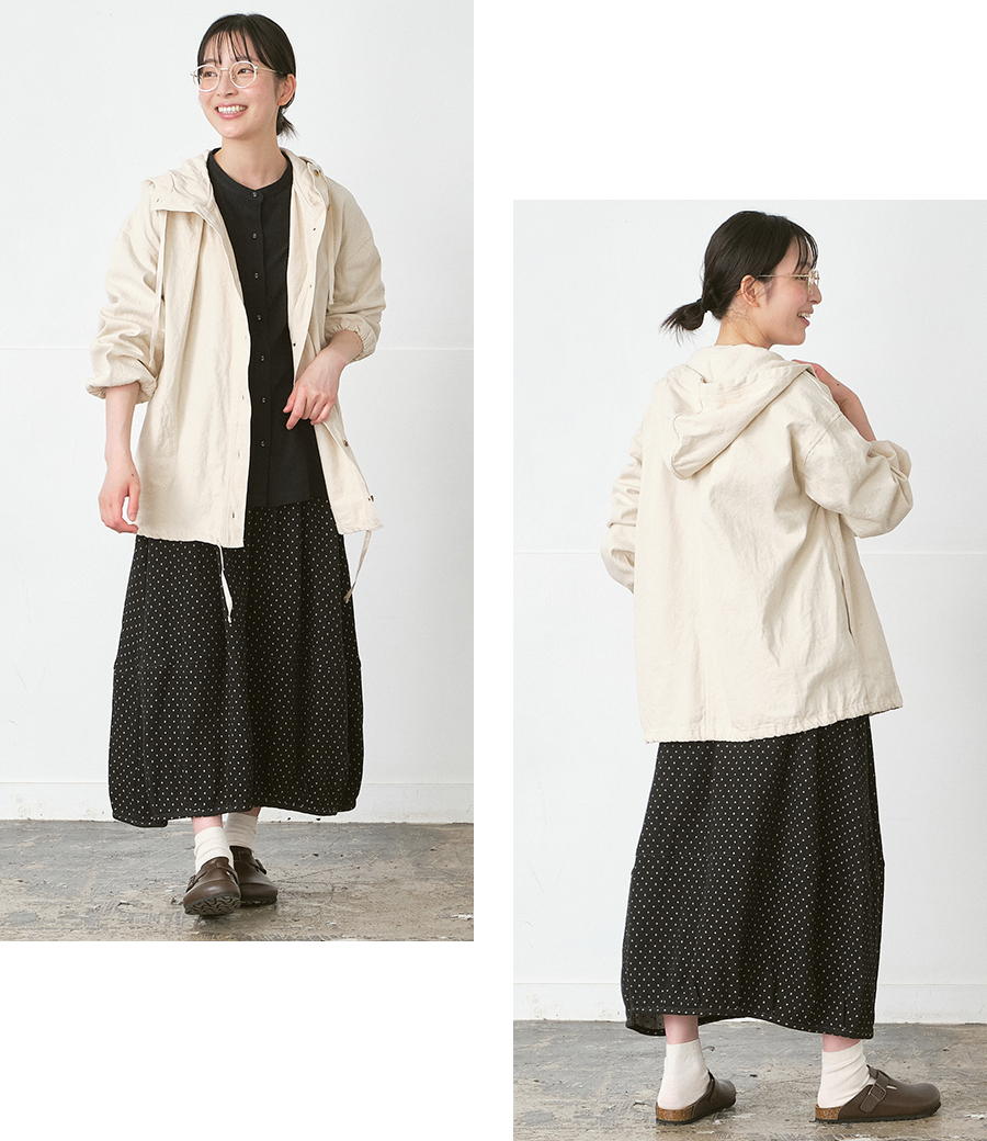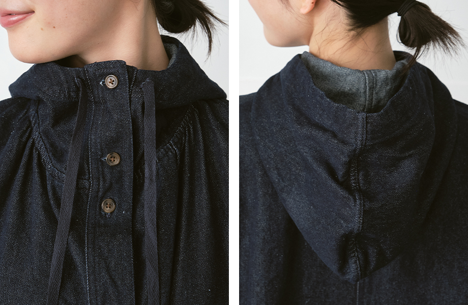 首まわりをやさしく包み込むように立ち上がるフードは、ほどよいボリュームで顔まわりをすっきりと見せてくれます。