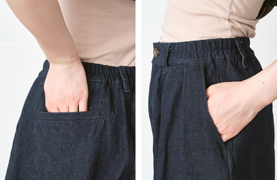 ヒップには片玉縁ポケットをあしらい、シンプルな中にさりげないアクセントを添えています。