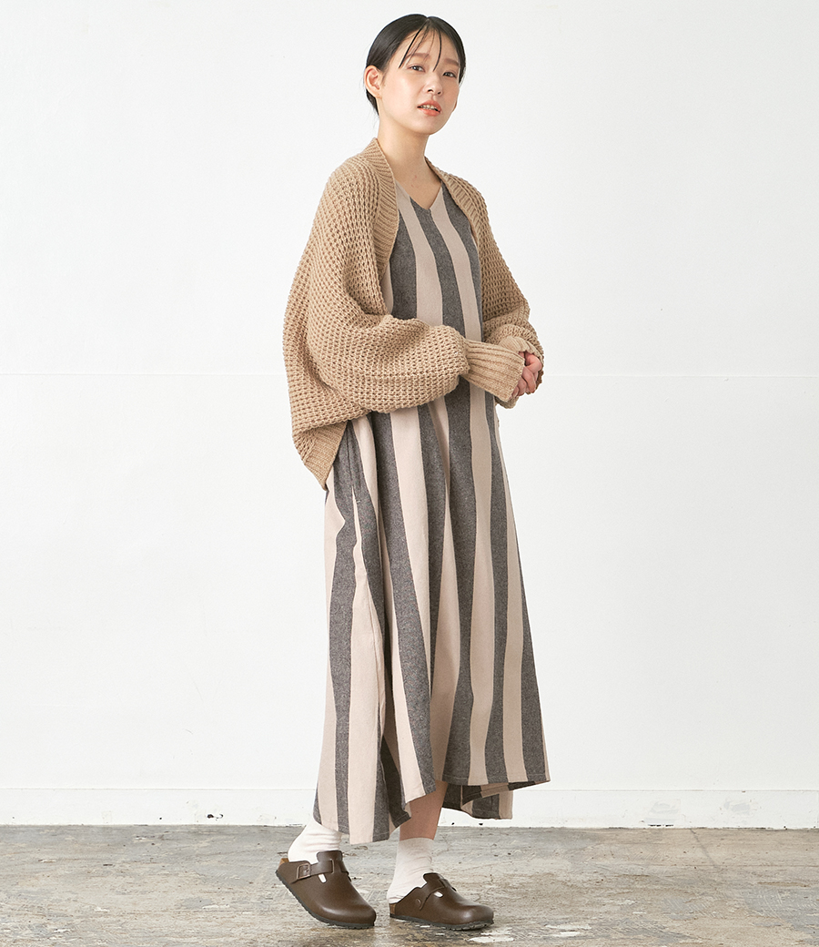 ワンピースのゆったり感に、ニットボレロの短丈がほどよいバランスを添える冬の重ね着。