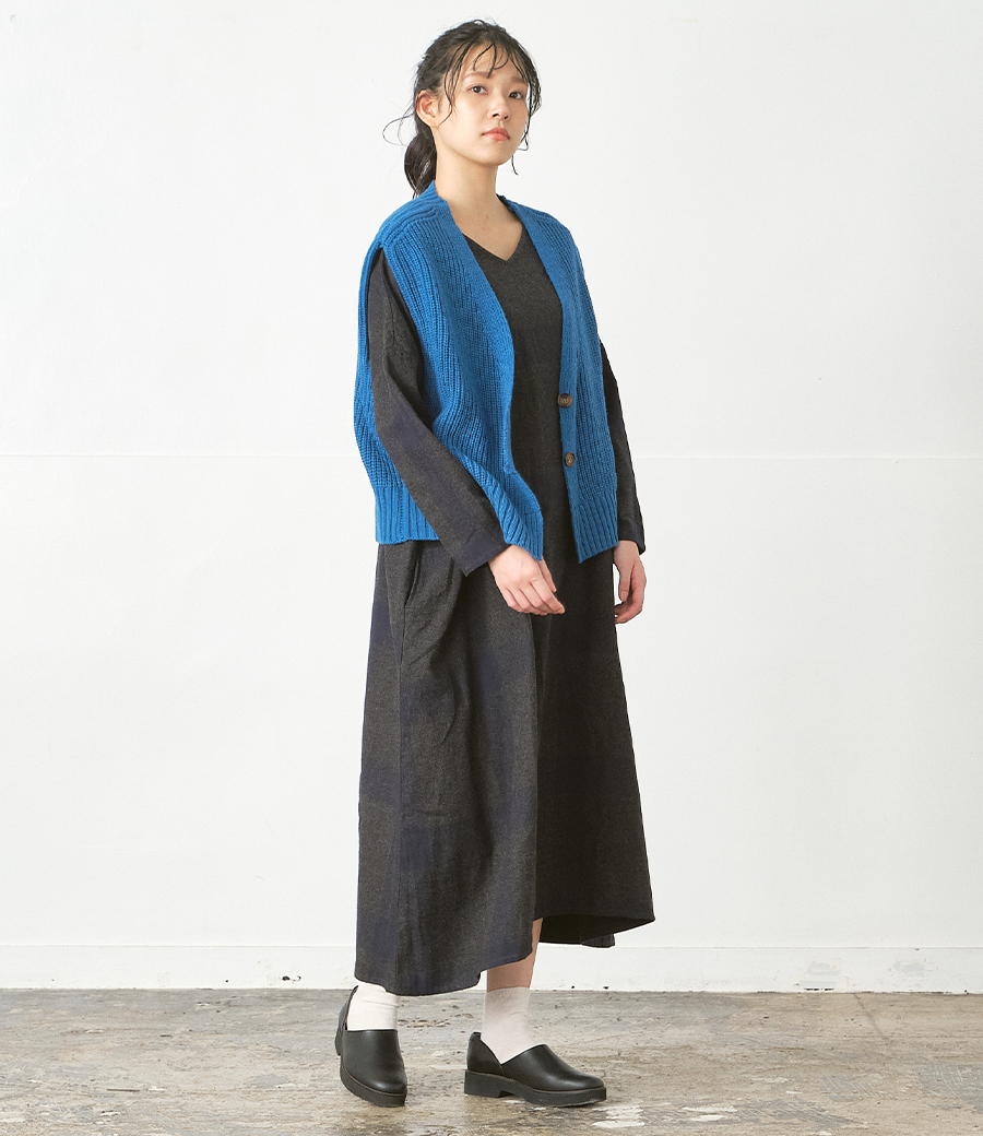 Vネックのワンピースに前ボタンニットベストを重ねて、冬らしいあたたかさと着映えを両立したコーディネート。