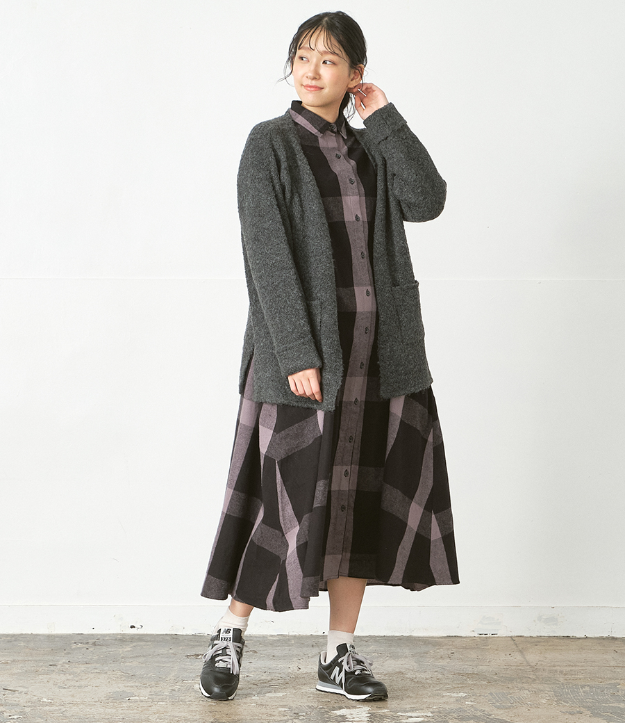 大柄チェック柄のシャツワンピースに、ブークレー素材のショールカーディガンをさらりと羽織った冬のコーデ。