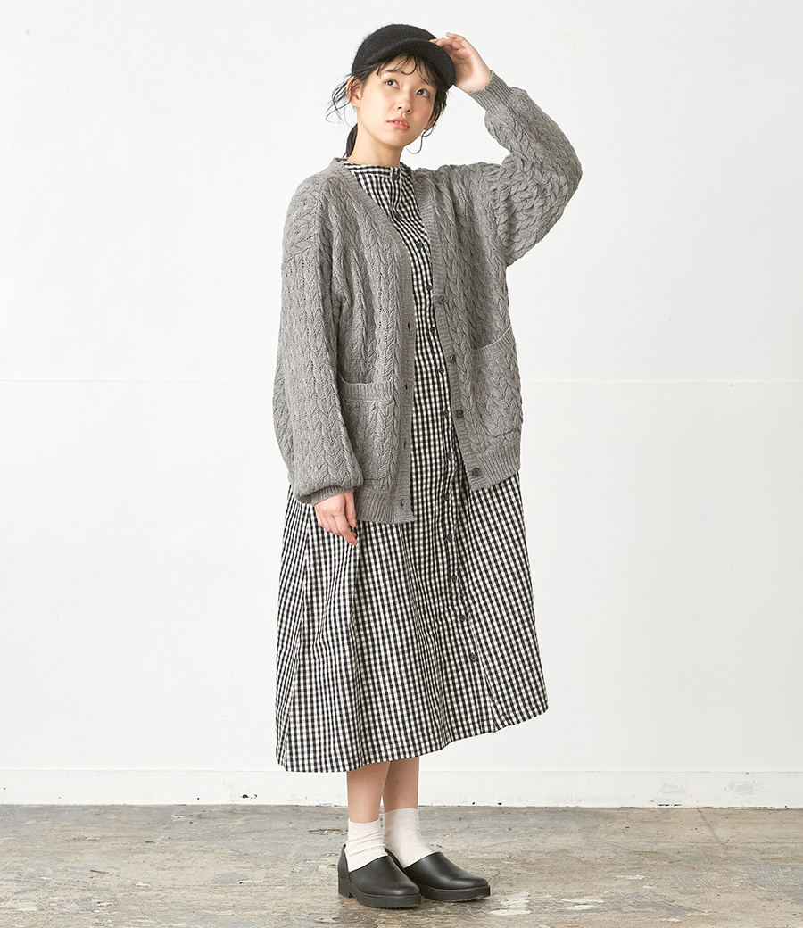 ふわりとしたケーブル編みのカーディガンが、チェックワンピースにやわらかな温度を添える冬のコーデ。