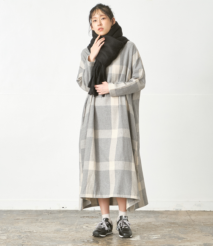 ゆったりとしたチェックワンピースに、大判のウールストールを大胆に巻いたスタイリング。