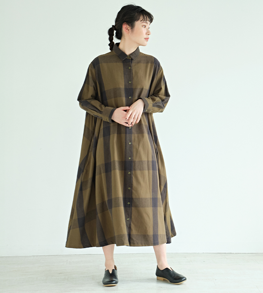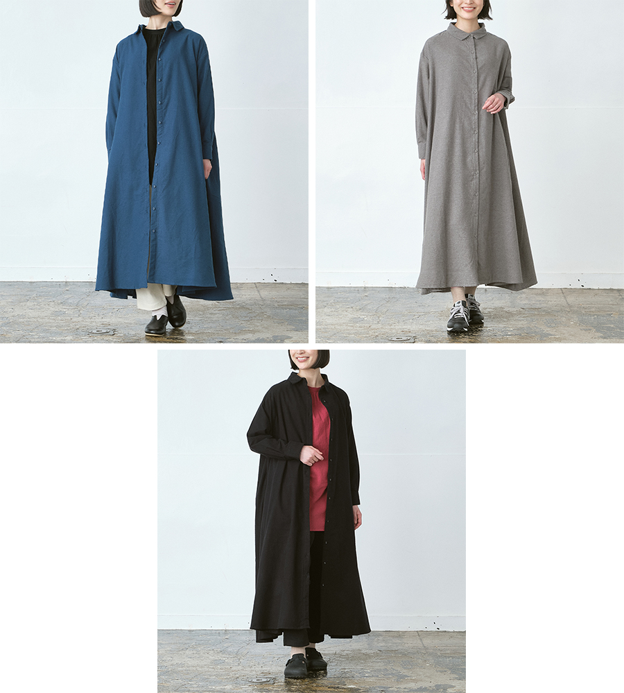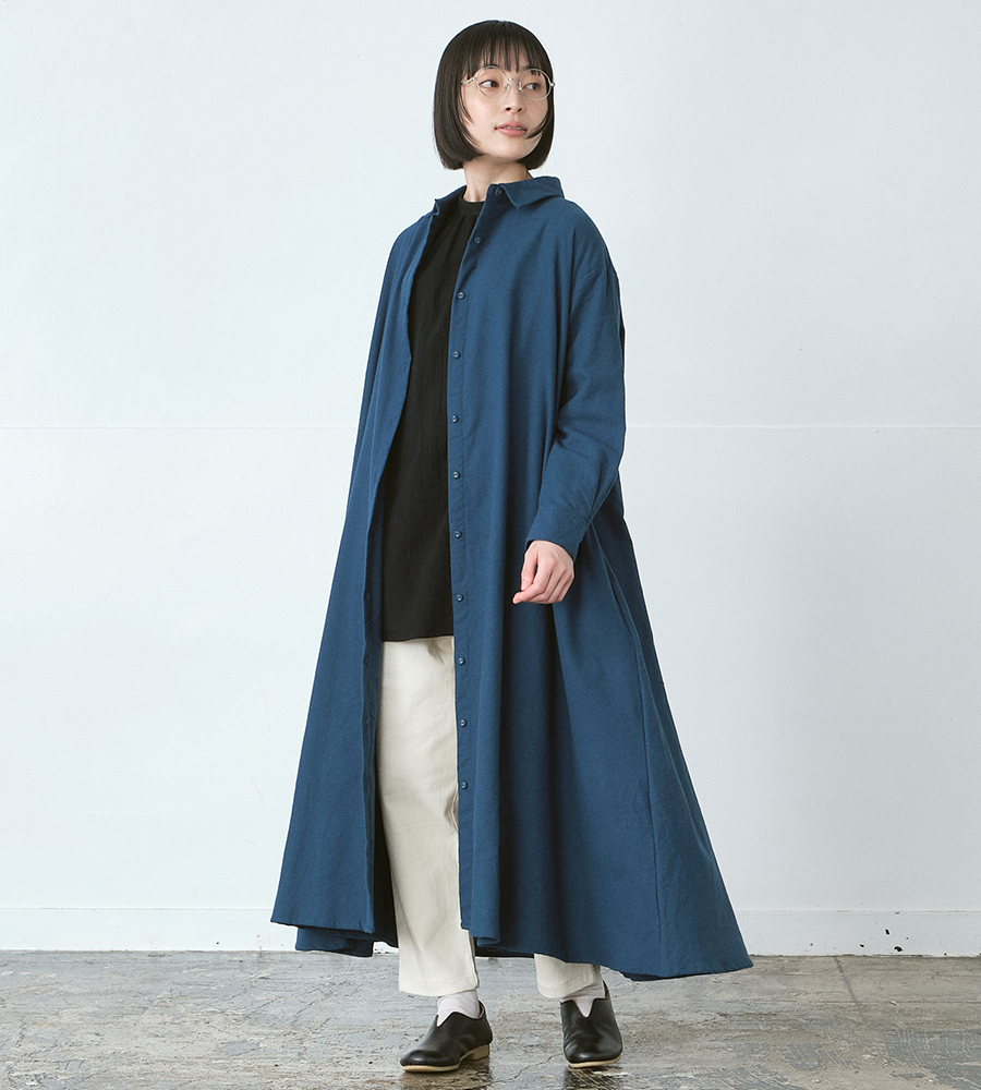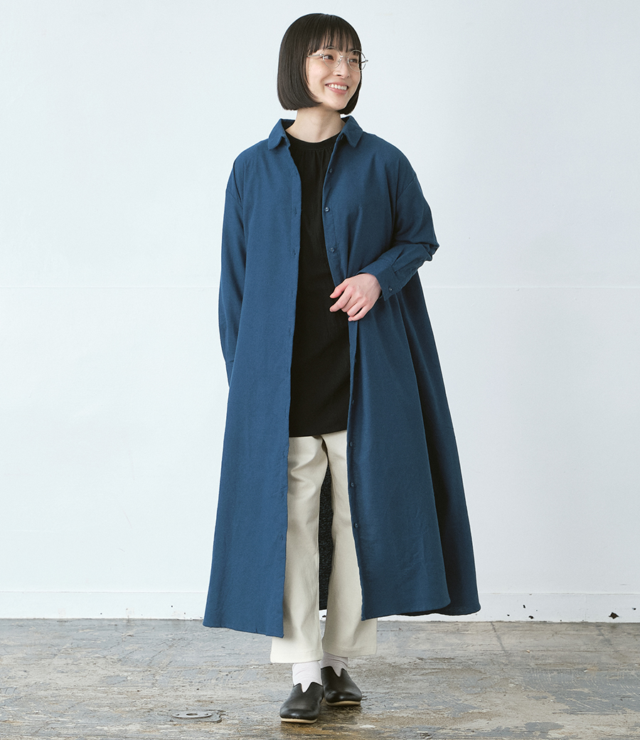 ふんわりと起毛させた綿オックス生地が、温かな表情をつくるシャツワンピース。