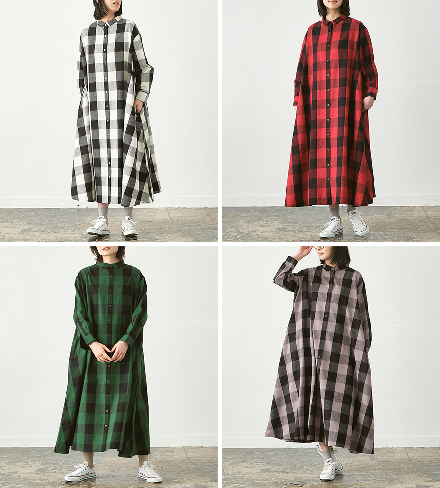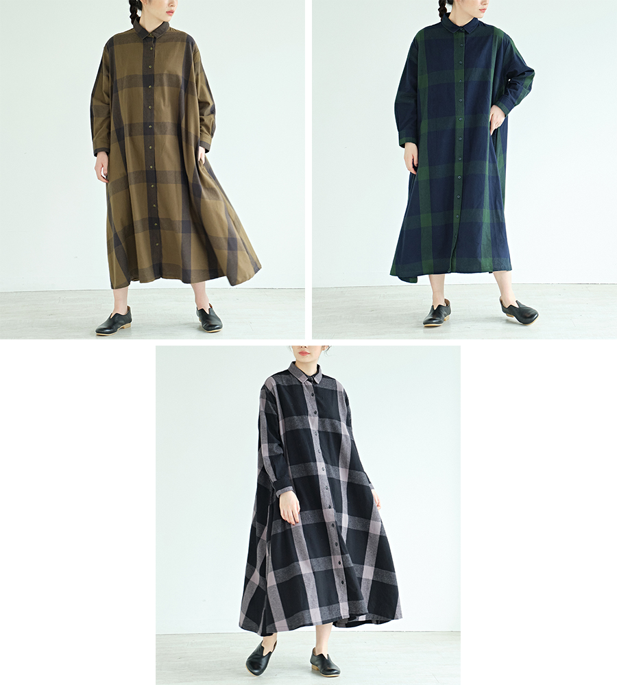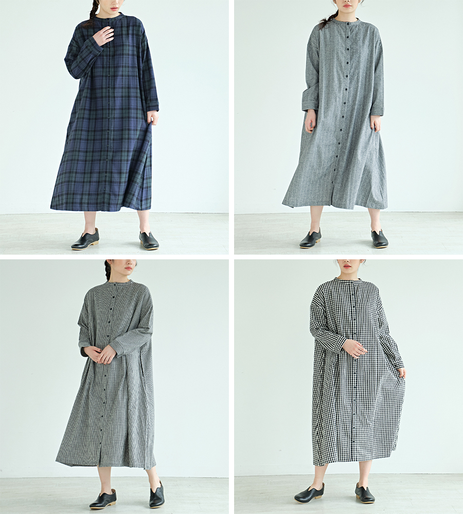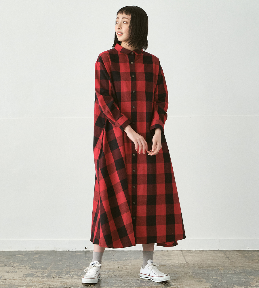 ふんわりと起毛させた綿オックス生地が、温かな表情をつくるシャツワンピース。