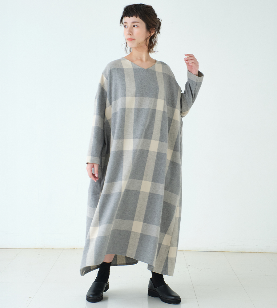 チェック柄の存在感をやさしく引き立てる、ゆったりシルエットのVネックワンピース。