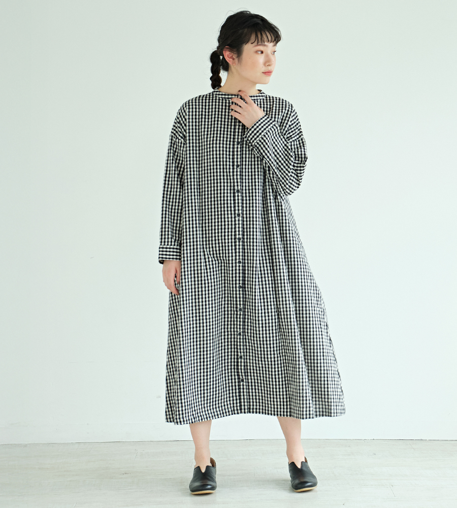 スタンドカラーがすっきりと上品な印象を添えるチェックワンピース。