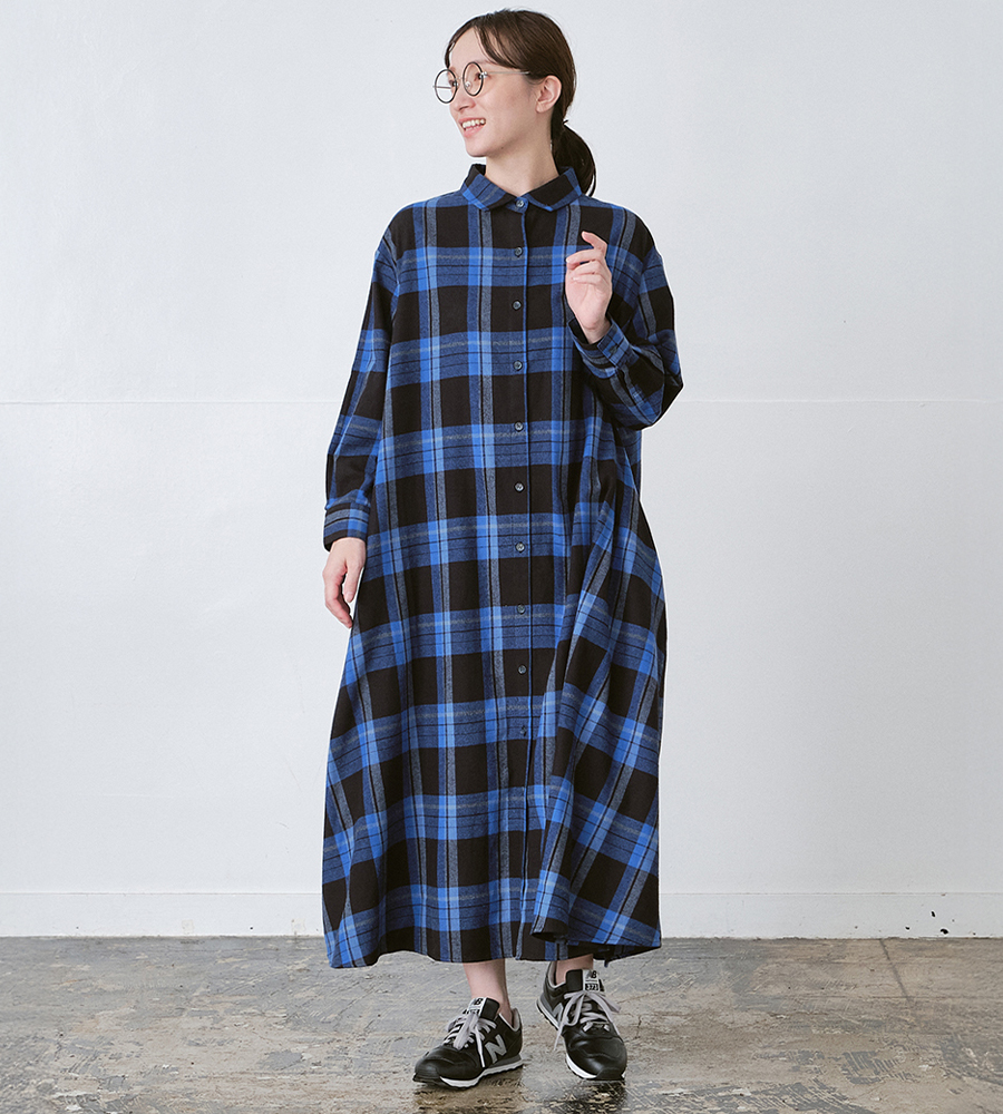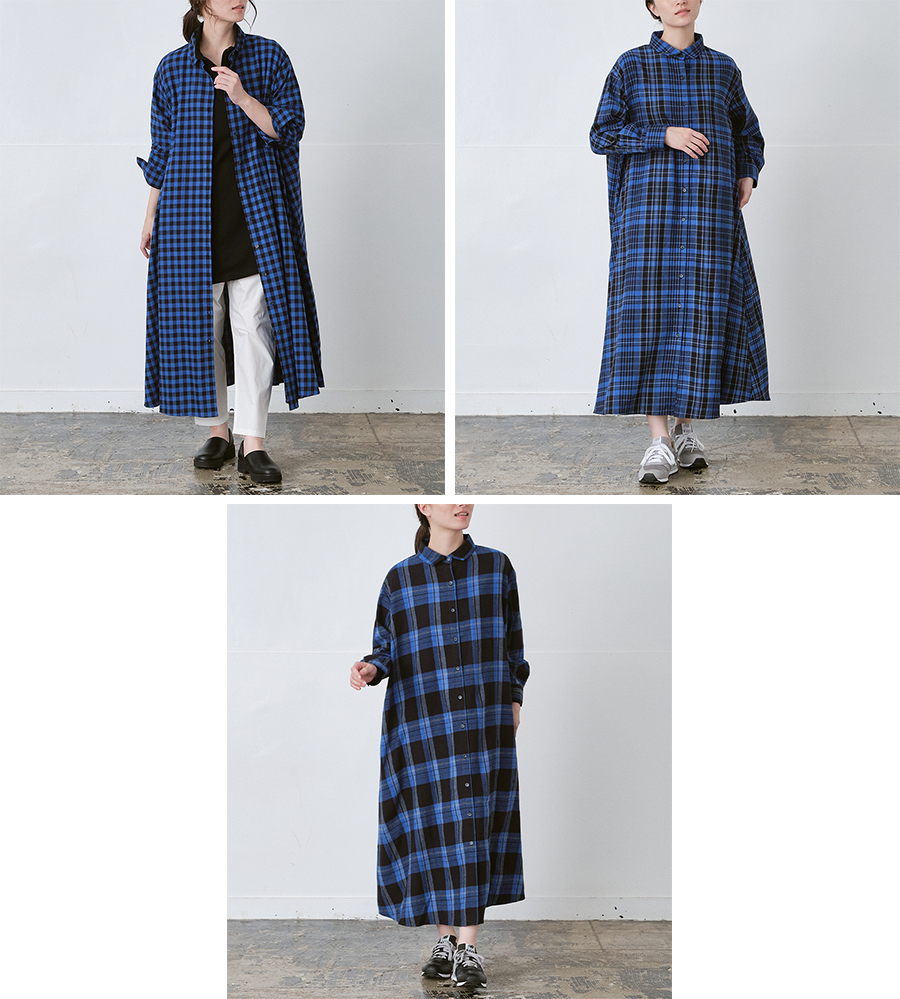 鮮やかなブルーが目を引くチェック柄を主役にしたシャツワンピース。