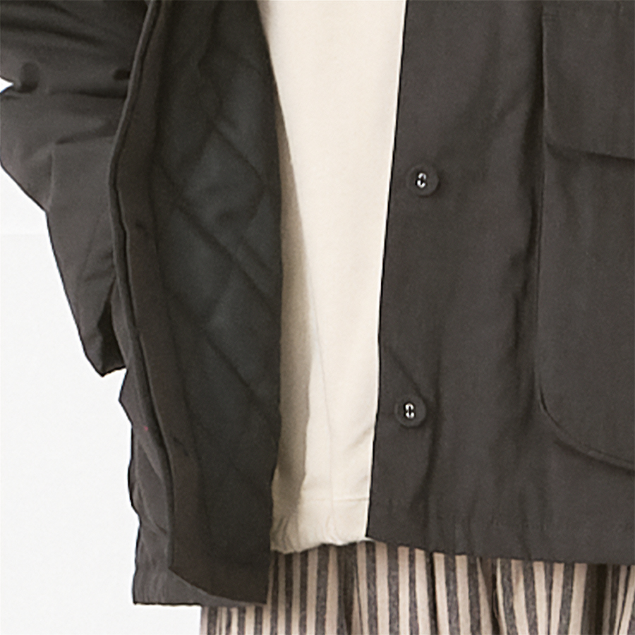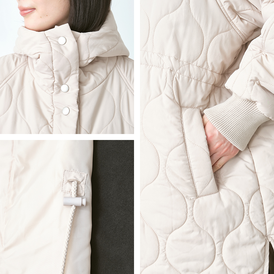 表はシンプルに、内側だけにキルトを配置することで、 着ぶくれせずスマートな印象のまま、しっかりと暖かさをキープ。