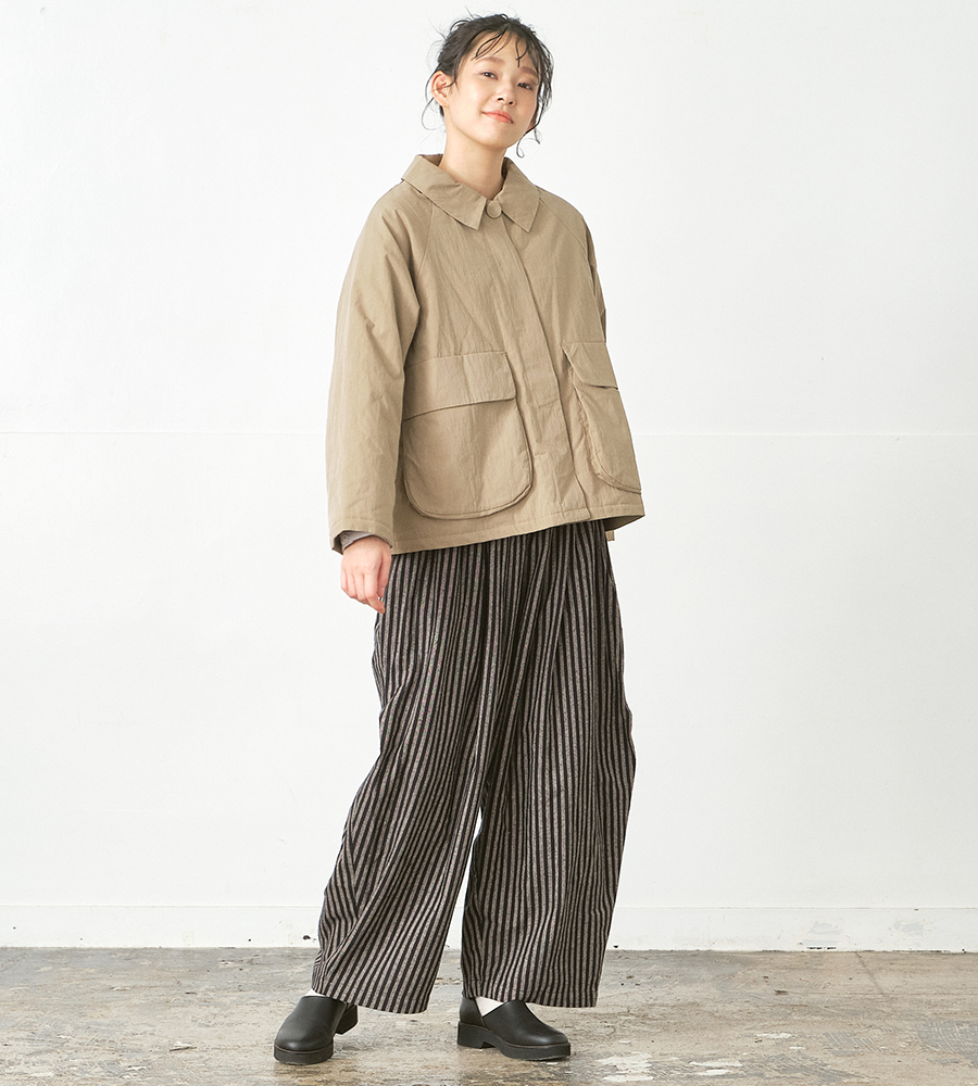 ストライプのワイドパンツが動きを添え、ナチュラルさの中にほんのり洗練を宿したスタイルです。