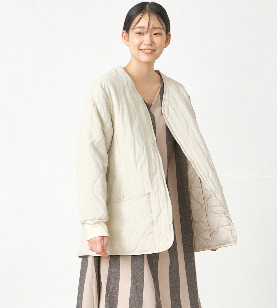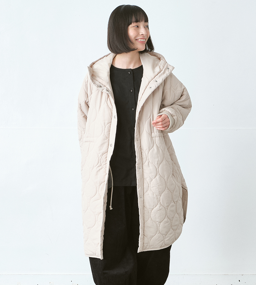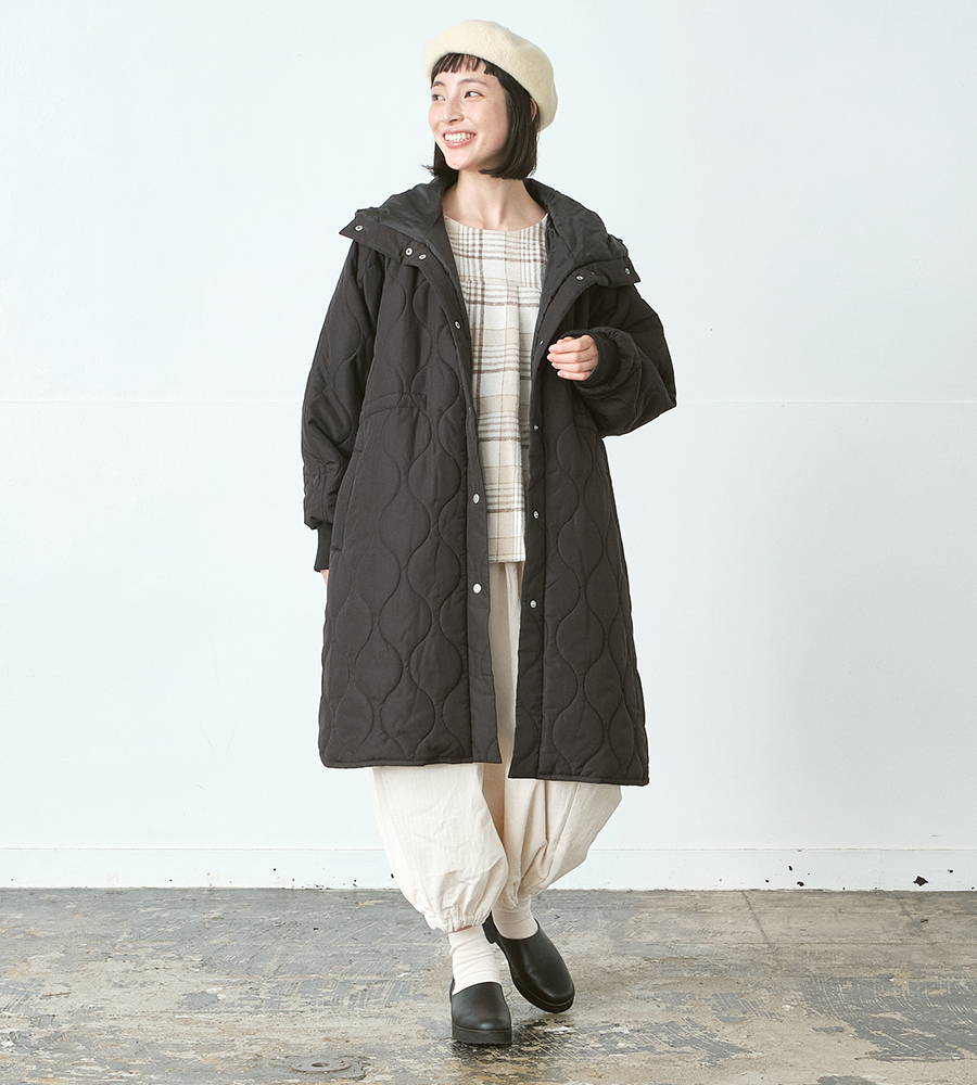 中わたをしっかり支え、暖かさを保ちながら、丸みのある表情でコーディネートをやさしく見せてくれます。