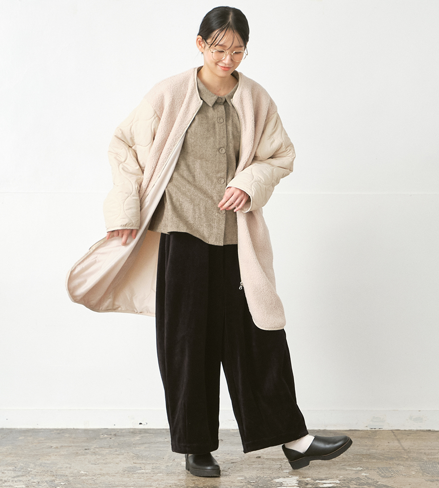 柔らかな配色のボア×キルトコートを主役に、穏やかな温かみのある冬スタイルに。