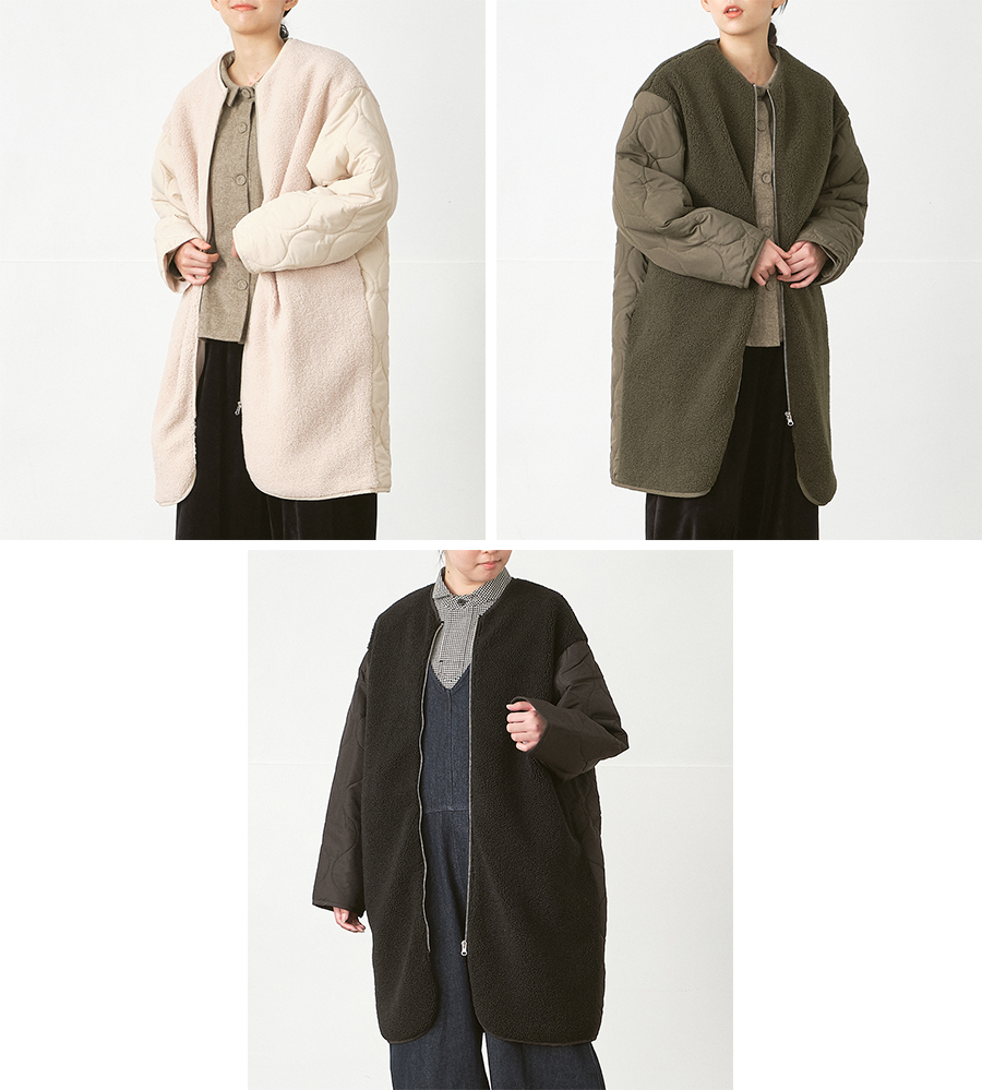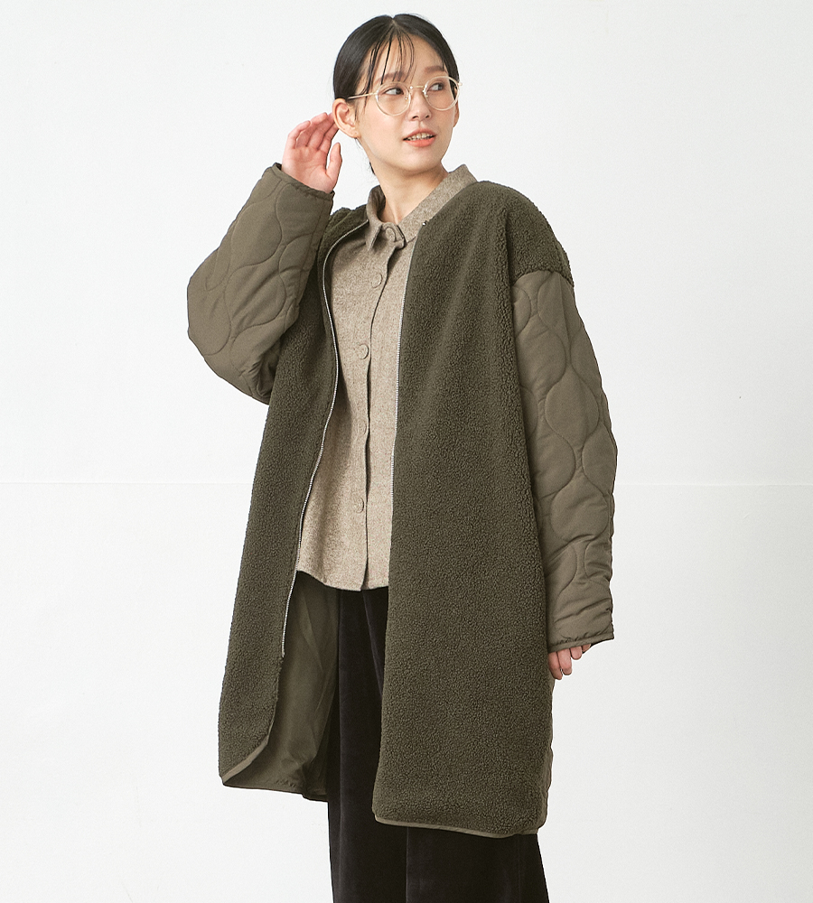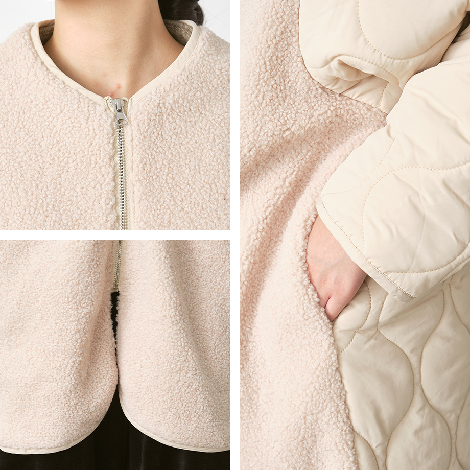 温もりたっぷりのボアとすっきりしたキルトをミックスした、季節感のあるアウター。
