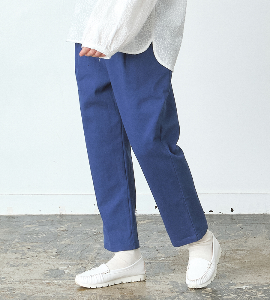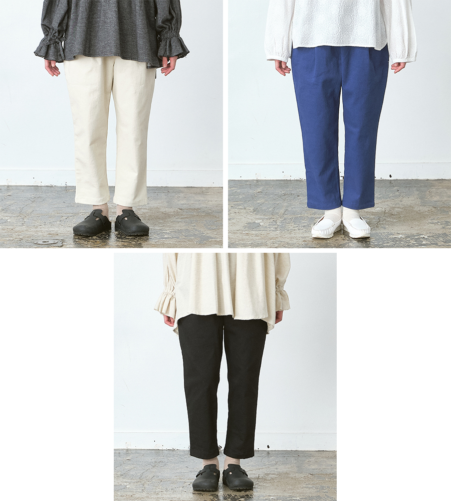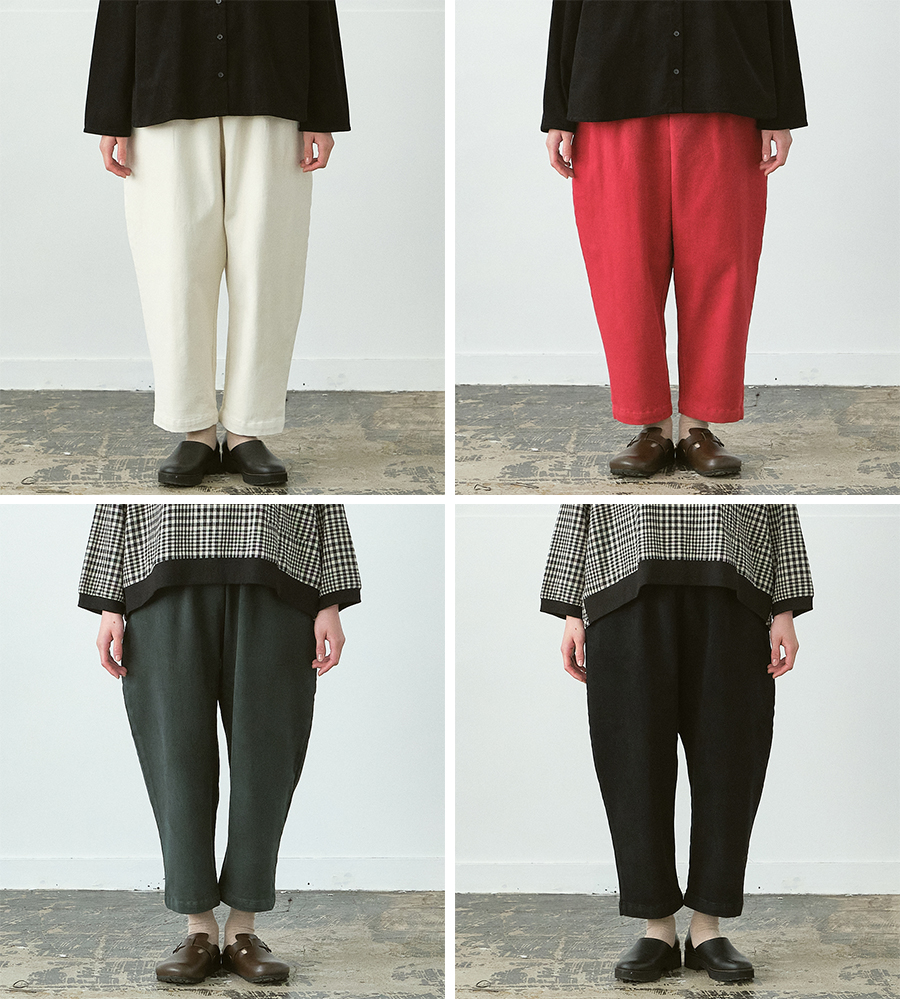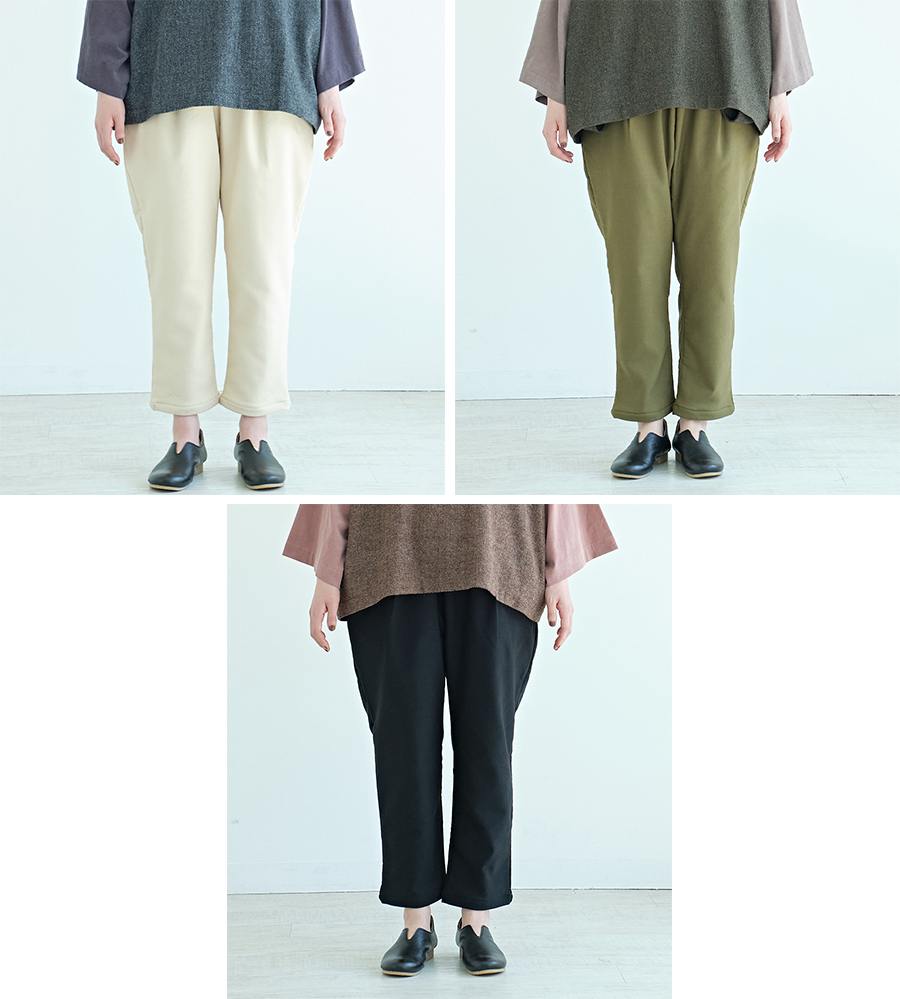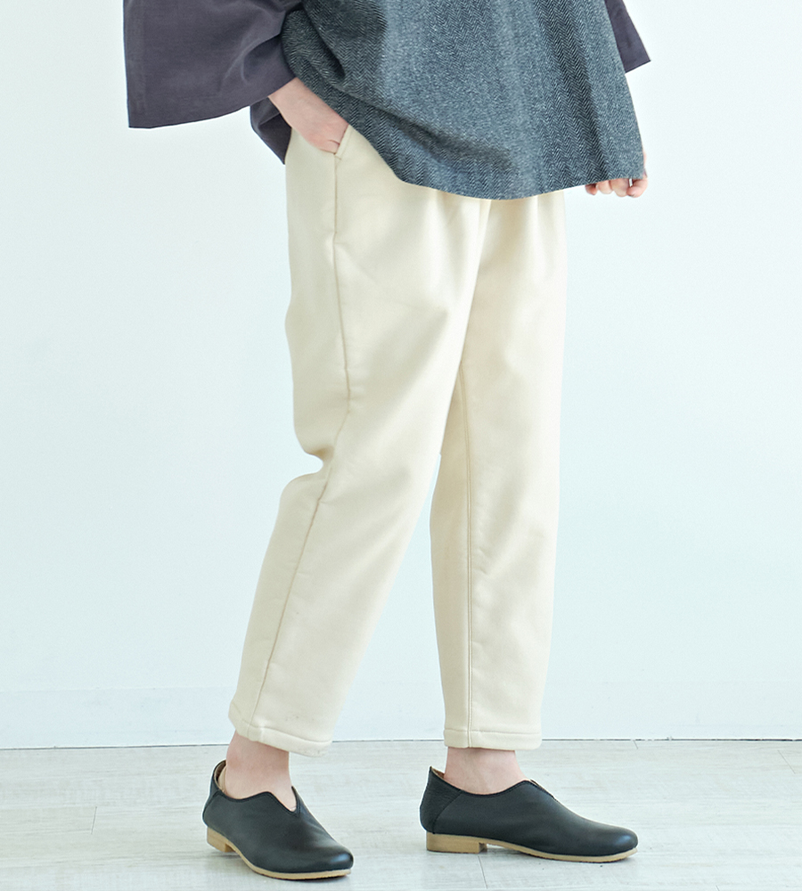 裏起毛やあたたかみのある生地を使用し、寒い日でも安心して着られるパンツ。
