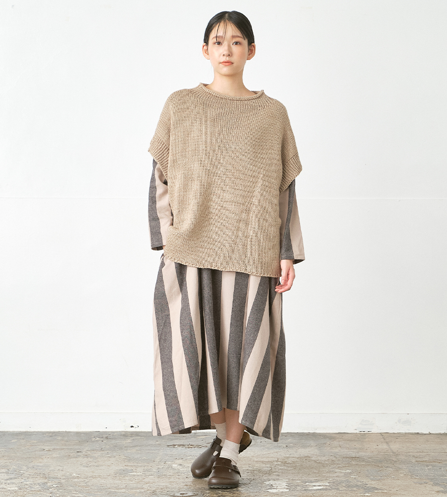 ワンピース一枚で着るのとは異なり、 プルオーバータイプのニットベストを重ねることで、 防寒性を高めながら、装いに奥行きとあたたかさが生まれます。