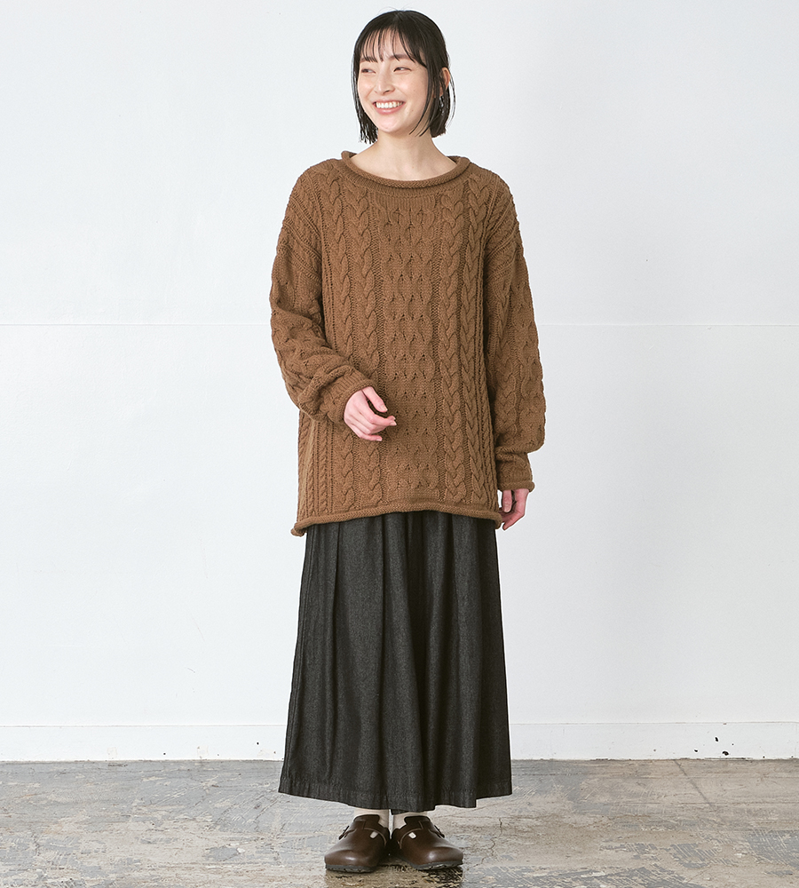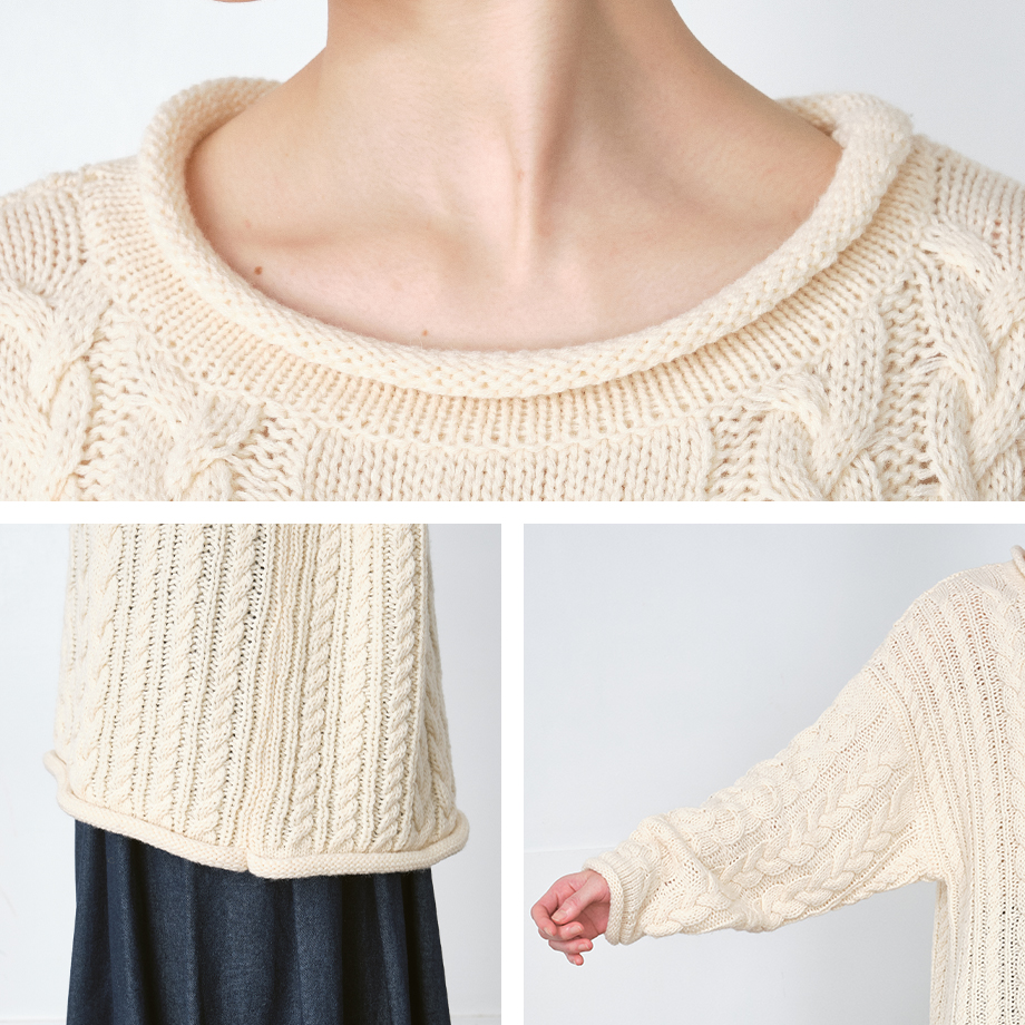 ほどよいラフさが加わり、 ケーブル編みの表情をやわらかく引き立てています。