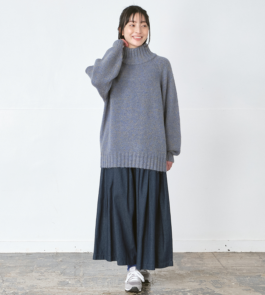 ボリュームのある袖と、7Gミックスニットならではの表情が、 シンプルなデニムガウチョパンツと好バランス。