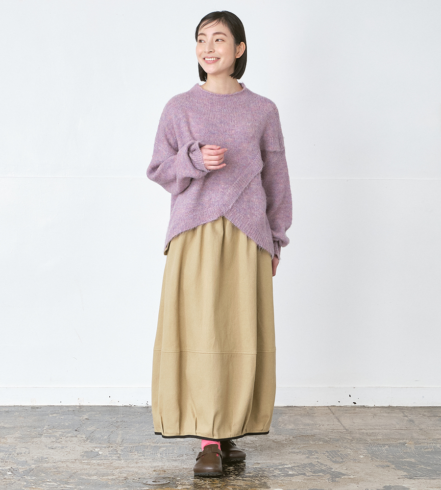 丸みのあるシルエットが特徴のバルーンスカートと合わせることで、 ニットの立体的なデザインがより引き立ち、 動きのあるやわらかな印象に。