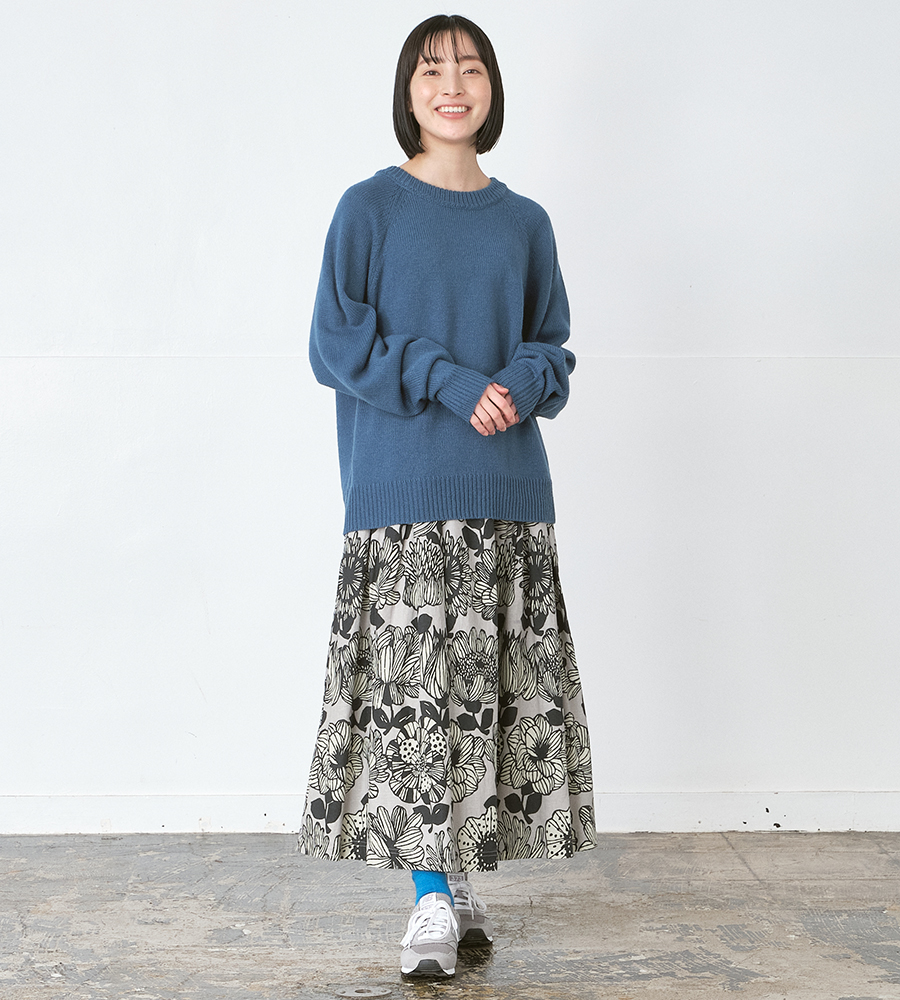 主張しすぎないデザインだからこそ、 綿麻の大花プリントが印象的なフレアスカートとも好相性。