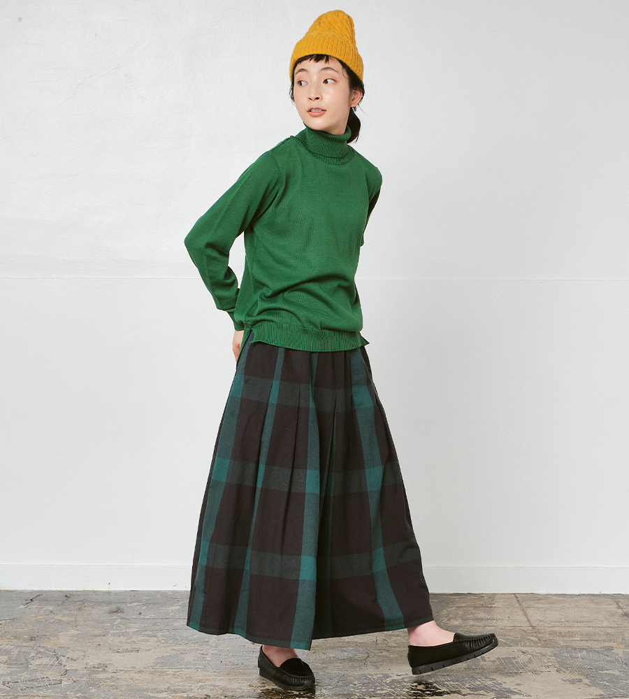 シンプルなニットが柄を引き立て、 落ち着きのある中に遊び心を感じさせる冬のコーディネートに仕上がります。