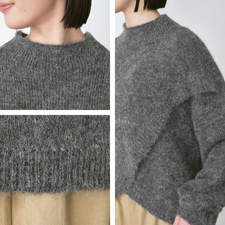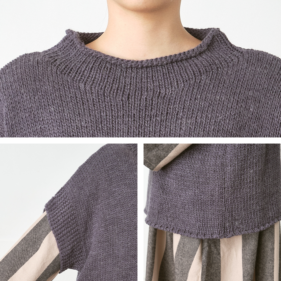 襟・袖口・裾は、針抜きのリブ編みで仕上げ、 ほどよいフィット感と表情をプラス。