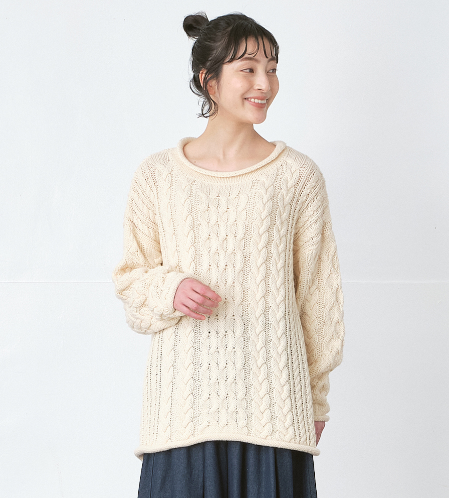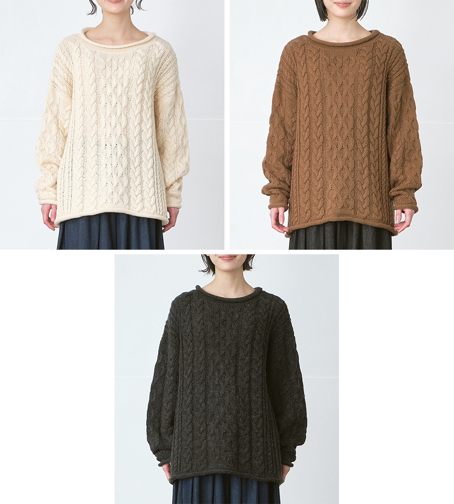 アラン諸島の漁師たちが着用していたセーターを起源とする、 伝統的な編み模様「アラン柄」を取り入れたニットプルオーバー。