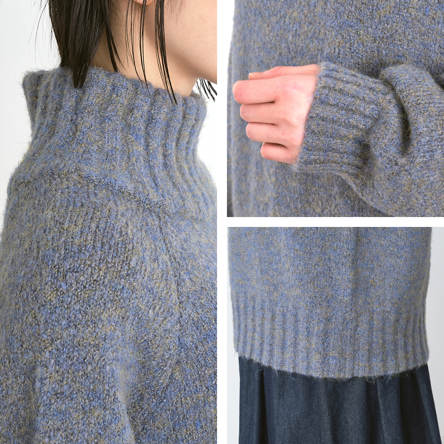 首元まで包み込むハイネックと、 ふんわりとしたボリューム袖が印象的なニットプルオーバー。