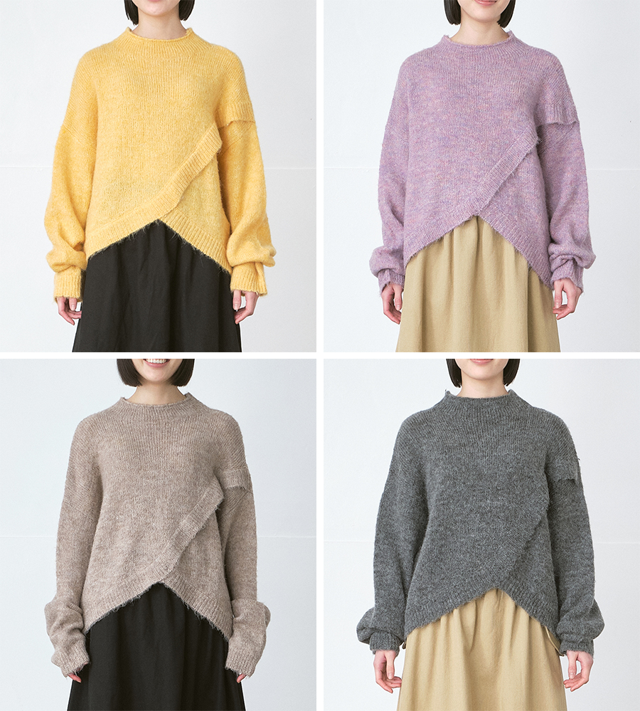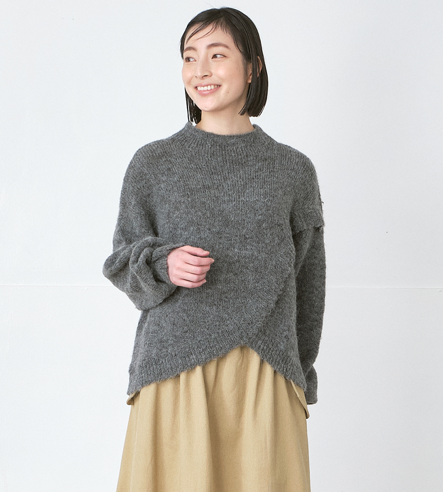 前後で表情の異なるデザインが目を引く、フロントクロスニットプルオーバー。 フロントは重ね着しているようなアシンメトリーなデザイン、 バックスタイルはすっきりとしたシンプルな仕上がりで、 一枚で着映えするバランスの良さが魅力です。