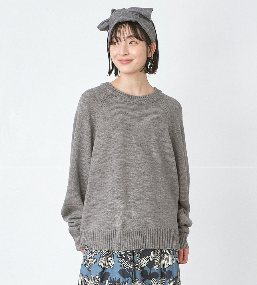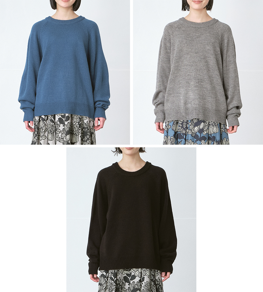 一見ベーシックなクルーネックニットプルオーバーも、 袖を少し長めにしたり、全体にゆとりを持たせたりと、 細部にさりげない工夫が、おしゃれな印象を底上げします。