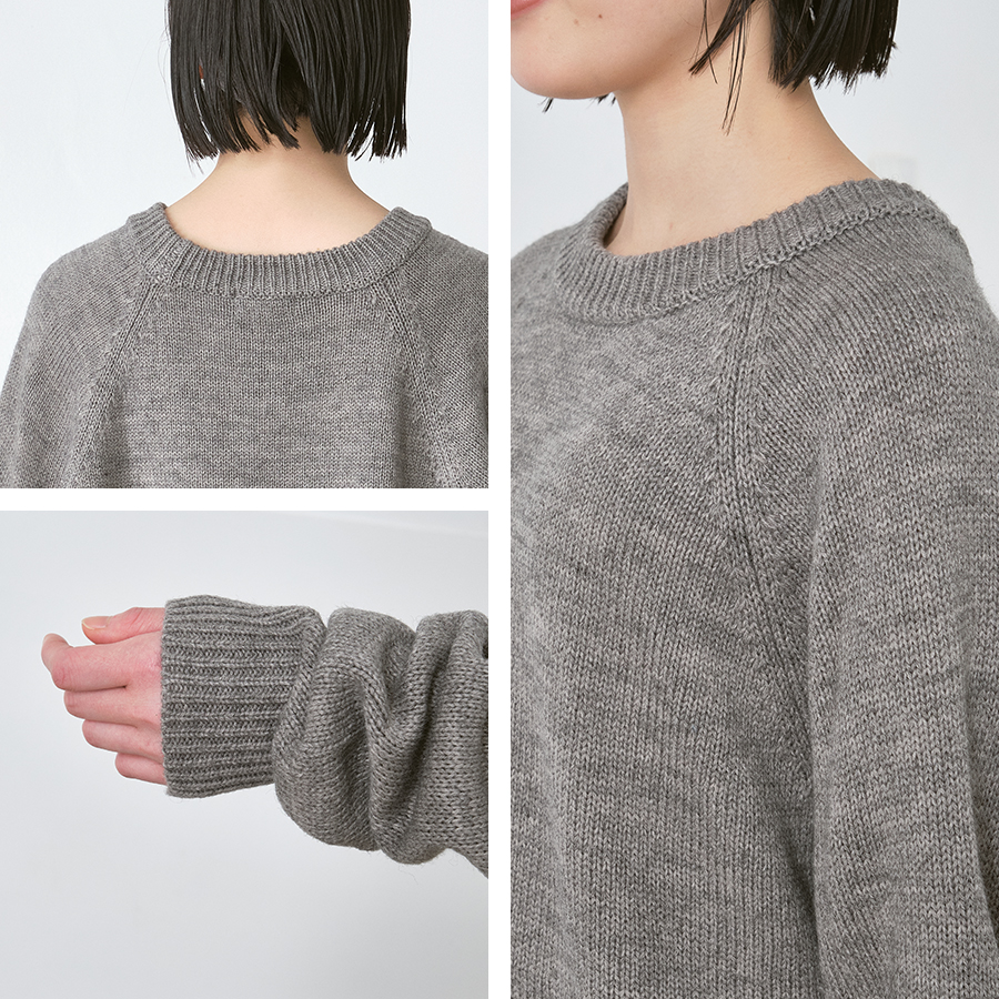 襟元はシンプルなクルーネック仕様。 ややルーズに仕上げることで、女性らしい柔らかな印象をプラスしています。