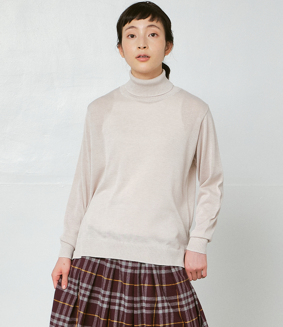 一枚でも、重ね着でも着回しやすい、ベーシックなタートルネックプルオーバーニット。