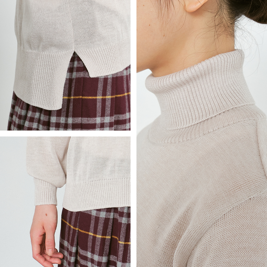 首元は、締め付け感を抑えたタートルネック仕様で、やさしく首に沿うデザイン。
