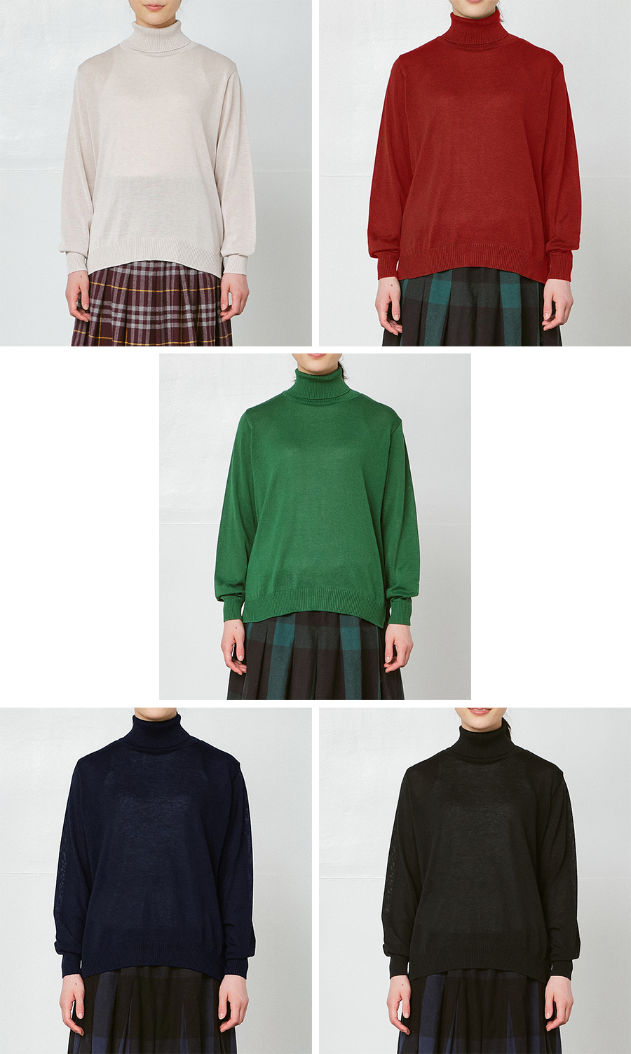 首元までやさしく包み込むタートルネックニットは、 一枚で着るだけでなく、重ね着でこそ魅力が引き立つアイテム。